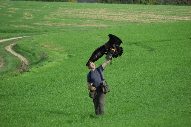 Nos journées nationales viennent de se terminer sous un soleil radieux. Point de pluie, point de vent, aucune nuisance dans une région assez plate parsemée de champs cultivés et de boqueteaux faciles à traquer. Malheureusement, l'été très chaud et particulièrement sec a décimé une population abondante de lièvres, ce qui pour nous est le gibier de prédilection. Nous avons été accueilli par des chasseurs avides de connaître notre déduit. Le premier jour, un GIC au complet nous attendait, curieux de voir évoluer nos oiseaux. Après le café et la brioche, nous nous lançons dans une traque longue, sans moutarde haute, colza grimpé, bref, sans difficulté aucune. Nous sommes quatre aigliers (seulement), Christophe et sa forme adulte, Steve et son tiercelet adulte, Guillaume et une forme adulte, moi-même avec Sarembaï, tiercelet adulte. Nous commençons par un champ très large de dactyle planté en vue d'une installation photovoltaïque de 15 ha l'an prochain (bravo l'écologie). Un bouquin déboule très loin de nous sans que personne ne le vole. puis approche un boqueteau d'un peu moins d'un hectare, nous l'encerclons pour laisser le temps aux traqueurs de faire un autre bois sur la droite un peu plus important. De là sortiront un chevrillard que je vole un peu loin, puis trois chevrettes que vole Christophe. Son aigle en couche une mais dès qu'il approche, le coup de rein qu'elle donne le décroche. Deux lièvres sortiront aussi de ce bois sans que nous les volions. Nous revenons aux voitures pour faire un autre champ plus grand. De grandes cultures s'offrent à nous ensuite, permettant une traque large et une visibilité sympathique pour les découvreurs. Sarembaï a mauvais caractère, il ne supporte pas le chaperon comme toujours en début de chasse. Nous descendons un vieux blé et en remontant vers la haie, il voit un lièvre au gîte à quelques mètres de moi. Je cherche une motte pour le lever, il s'élance et Sarembaï l'entreprend avec une énergie de fin d'après-midi. Ne vous méprenez pas, en fin d'après-midi, les aigles sont très agressifs et d'un caractère extrêmement vif. Il le griffe sans lui laisser la moindre chance à 80 mètres. Son entrée en chasse 2022 est faite. Je le récompense bien sur sa prise. La ligne continue la traque ; Christophe vole un lièvre de belle manière (dixit les rapports de chasse) Guillaume aussi. Seul Steve n'a pas volé pour l'instant. Nous rentrons pour casser une croûte. Les spécialités locales n'ont rien à envier aux nôtres, mais le moment de partage est toujours bien plaisant. L'après-midi, nous sommes allés traverser des  champs interrompus par de très grosses haies. Quelques boqueteaux interrompent cette promenade bien agréable somme toute. Christophe vole un chevreuil que je ne vois pas, il n'y aura pas prise. Steve vole aussi un lièvre sans conclure. Nous rentrons avec deux lièvres pris, des chasseurs qui découvraient notre art heureux, quelques voyeurs très impressionnés. Le repas du soir est pris en commun dans la salle des fêtes d'Avy.